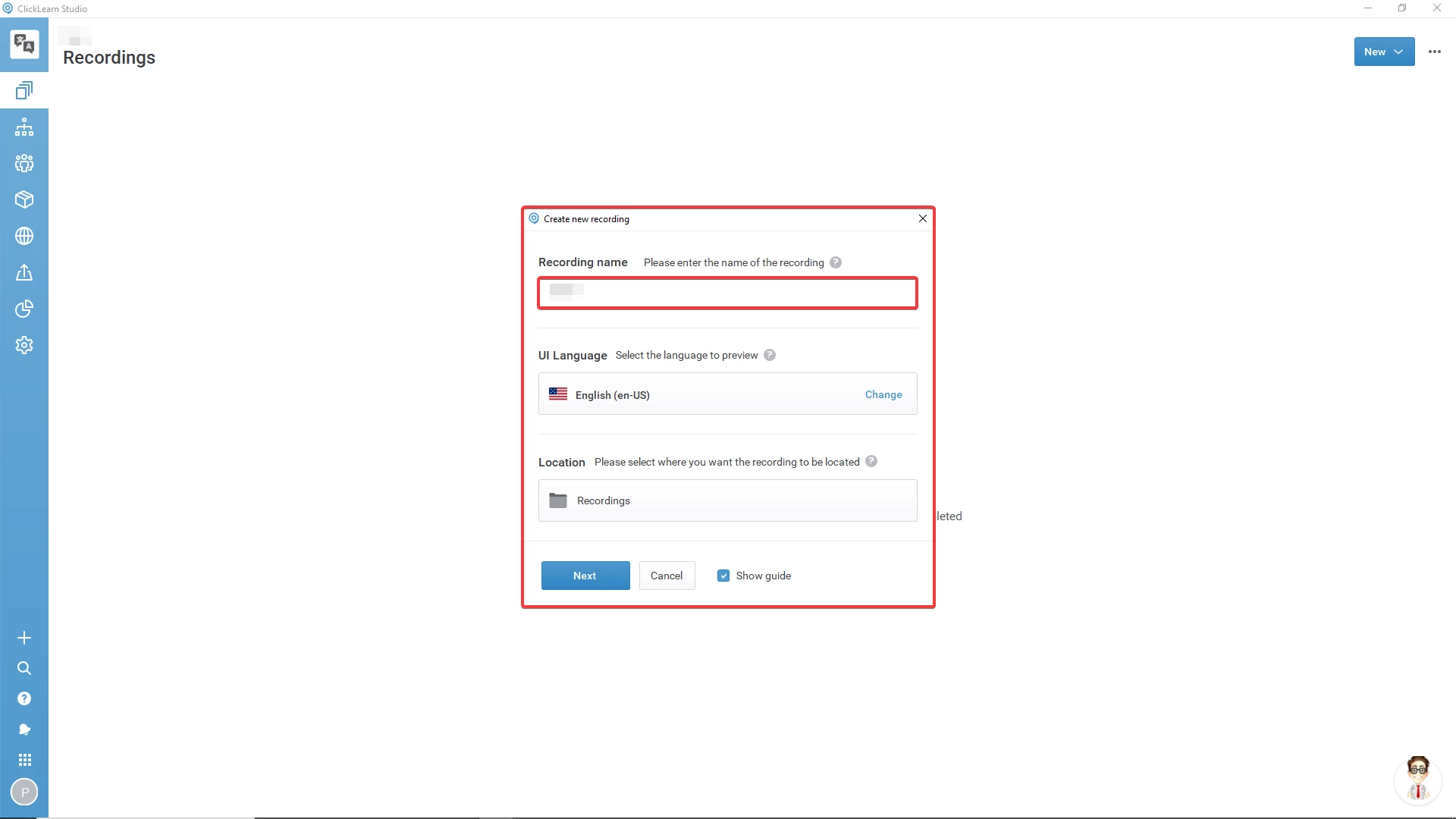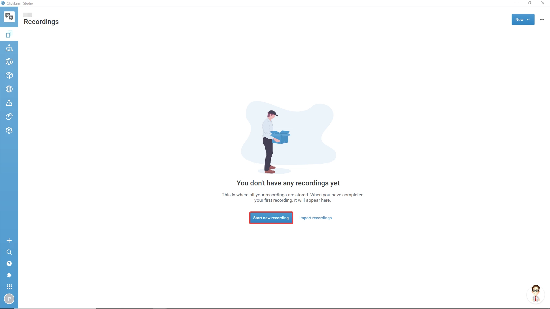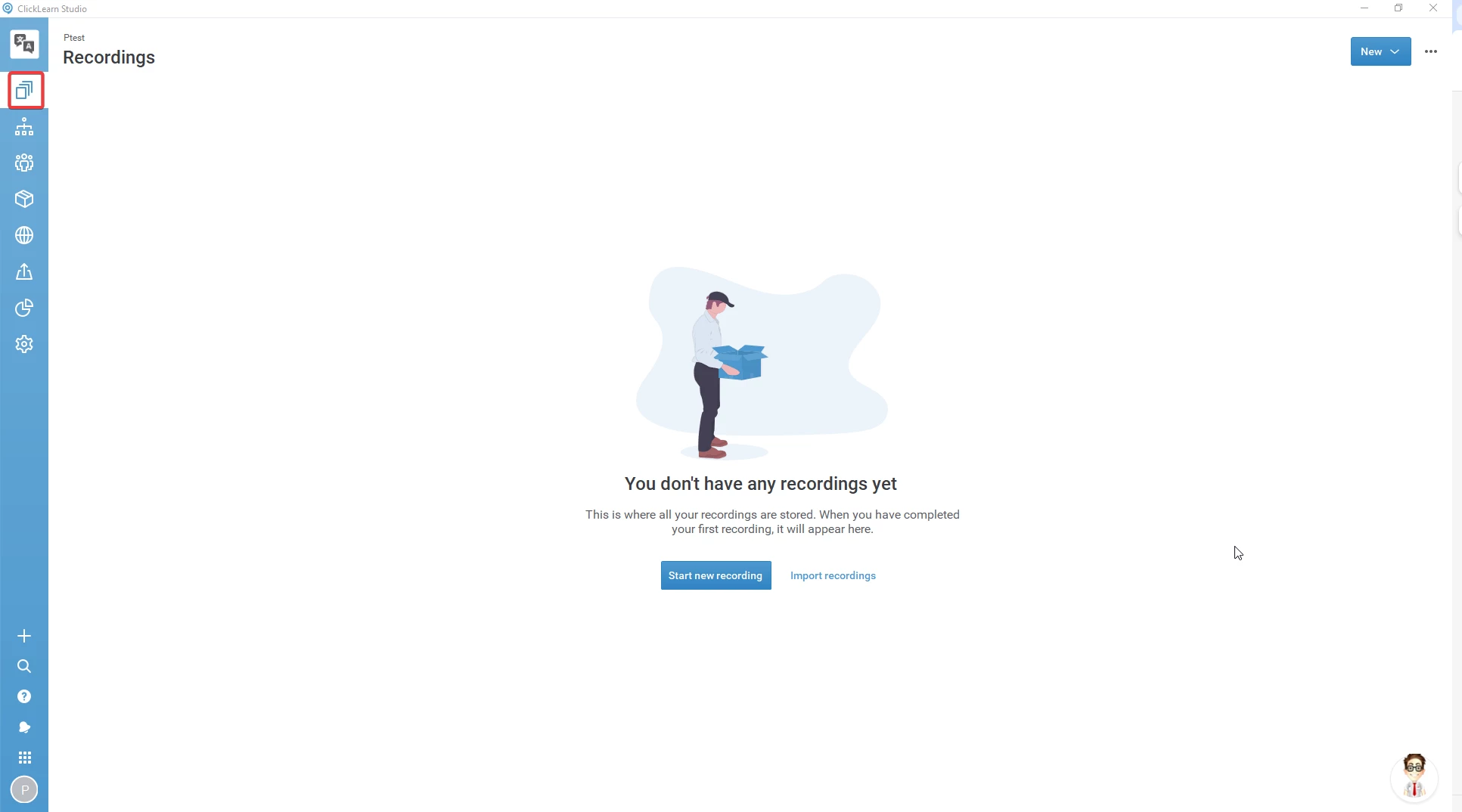 Open ClickLearn Attain on your system and navigate to the Recordings screen and click Start new recording.